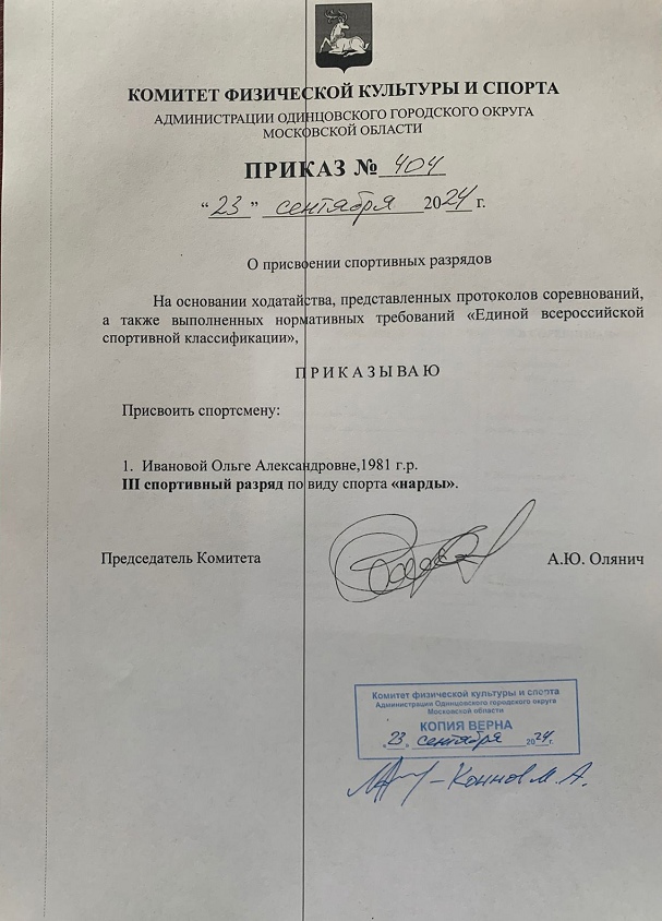 Ольге Александровне присвоен третий спортивный разряд по нардам. ... Первая официальная спортсменка в Московской области по виду спорта нарды.