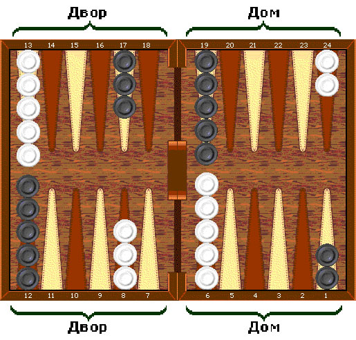 Пункты нумеруются для каждого игрока отдельно, начиная с дома данного игрока. Самый дальний пункт является 24-м пунктом, он также является первым пунктом для оппонента. У каждого игрока имеется 15 шашек. Начальная расстановка шашек такова: у каждого из игроков по две шашки в двадцать четвертом пункте, пять в тринадцатом, три в восьмом и пять в шестом.