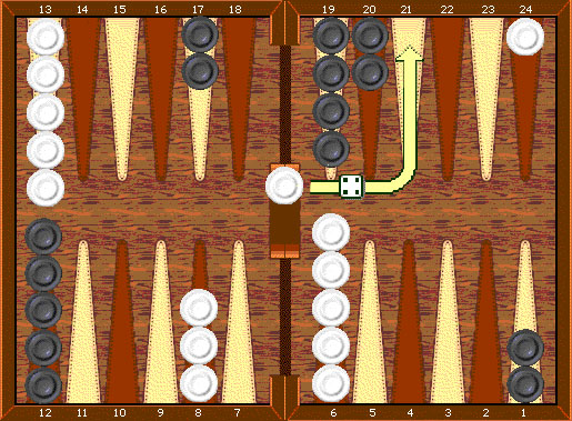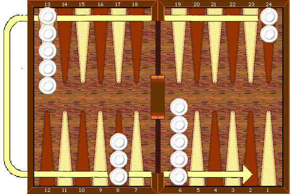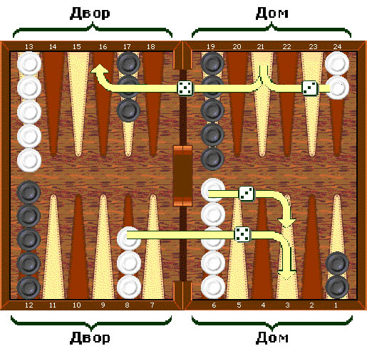Число на каждой кости показывают, на сколько пунктов, или пипсов, игрок должен передвинуть свои шашки. Шашки всегда движутся только в одном направлении, от пунктов с большими номерами к пунктам с меньшими.